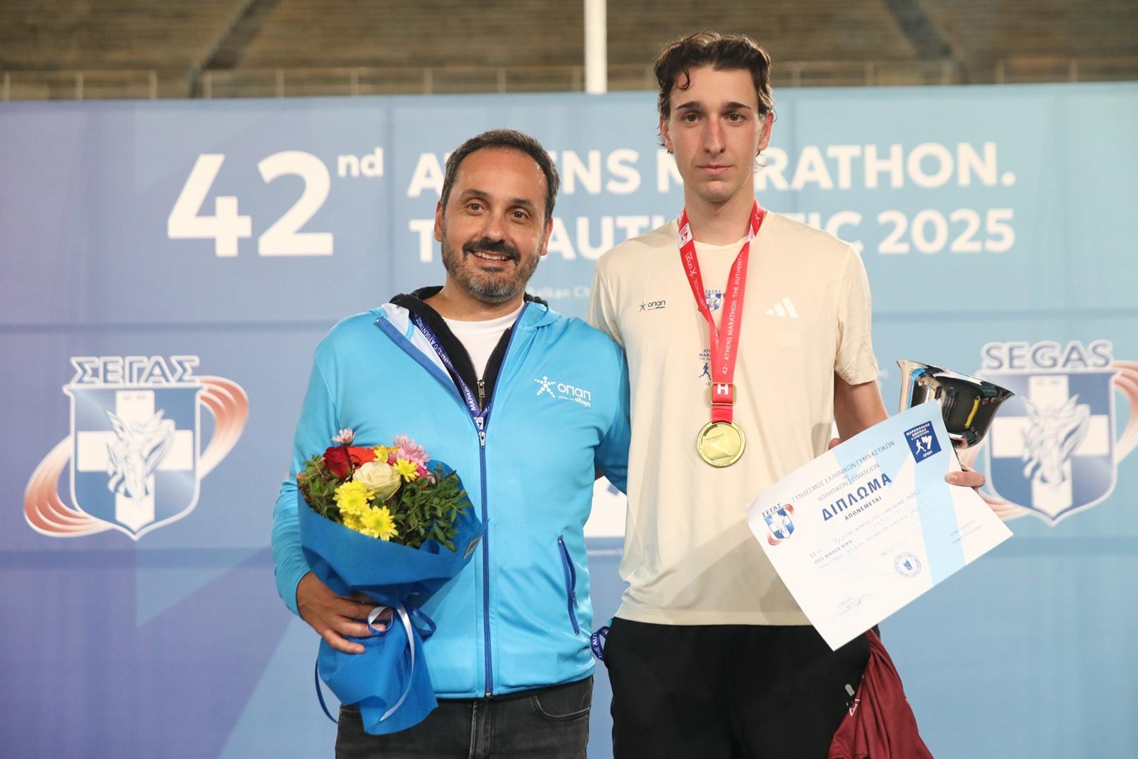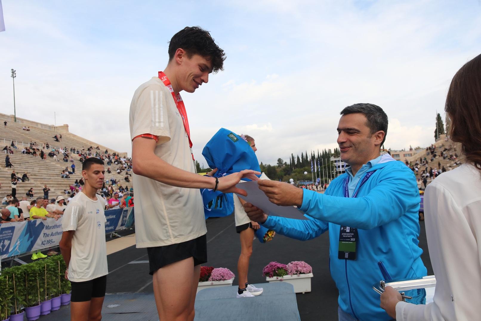 Ο Chief Customer Officer του ΟΠΑΠ, Lukas Antos, βραβεύει τη Σταματία Νούλα, νικήτρια του 42ου Αυθεντικού Μαραθωνίου της Αθήνας και του Πανελλήνιου Πρωταθλήματος Μαραθώνιου δρόμου