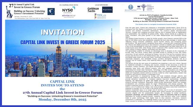 2025/12/07 at 5:59 ΜΜ 07/12/2025 newsroom27ο Ετήσιο Φόρουμ “Capital Link Invest in Greece” στη Νέα Υόρκη
