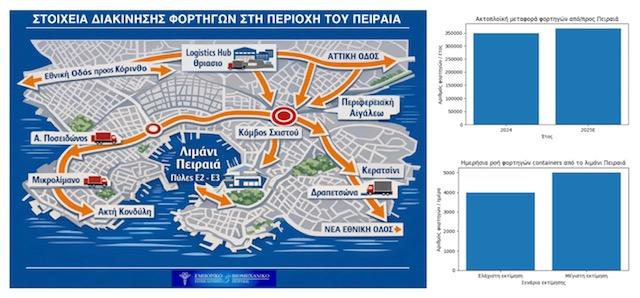 Συνολικά, η μέση ημερήσια διακίνηση φορτηγών που σχετίζονται με το εμπορικό και επιβατηγό λιμάνι του Πειραιά ανέρχεται σε περίπου 5.000 φορτηγά την ημέρα, με σημαντικά υψηλότερες τιμές κατά τις ώρες αιχμής και με 1.500-2.000 φορτηγά Δ.Χ. να χρησιμοποιούν τον Κηφισό. Η κλίμακα αυτή εξηγεί την έντονη επιβάρυνση του οδικού δικτύου, των λιμενικών πυλών και των logistics κόμβων της ευρύτερης περιοχής. Η βασική επιβάρυνση του οδικού δικτύου και η αυξημένη συμφόρηση στους κόμβους του ευρύτερου Πειραιά εντοπίζονται στη Λ. Ποσειδώνος – Ακτή Κονδύλη – Ακτή Ξαβερίου – Λ. Σχιστού – Σκαραμαγκάς – Περιφερειακή Αιγάλεω – Κερατσίνι και Δραπετσώνα σε σύνδεση με τον Κηφισό, την Αττική Οδό και τις Εθνικές Οδούς, Αθηνών–Κορίνθου και Αθηνών-Θεσσαλονίκης.