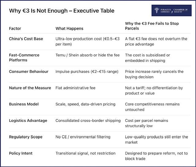 Η ετήσια αύξηση κατά 26% των φθηνών εισαγωγών σε 5,8 δις δέματα το 2025 σε σύγκριση με τα 4,6 δις δέματα του 2024 από την Κίνα, οδήγησε την ΕΕ σε μία απόφαση που ναι μεν βάζει τέλος στα δωρεάν μικροδέματα, αλλά δεν θα περιορίσει τη ροή τους λόγω της μεγάλης διαφοράς των τιμών και των περιθωρίων που έχουν οι ασιατικές πλατφόρμες να απορροφήσουν εύκολα από το 0,5 τα 3 ευρώ με επιπλέον εκπτώσεις. Οι άλλοι λόγοι που τα 3 ευρώ δεν αρκούν είναι η συμπεριφορά του καταναλωτή, ενώ το μοντέλο των logistics παραμένει άθικτο, αφού δεν πρόκειται για δασμό, αλλά πάγιο τέλος. Ερωτηματικά μάλιστα εγείρει η χρονική καθυστέρηση 6 μηνών για την υλοποίηση της πολιτικής δέσμευσης του Νοεμβρίου. Με το μέτρο αυτό η Ευρώπη δεν απαντά πλήρως στο γεγονός ότι τα μικροδέματα από τις γνωστές πλατφόρμες που εισέρχονται προς το παρόν αδασμολόγητα, οδηγεί σε αθέμιτο ανταγωνισμό, αλλά και κινδύνους για την υγεία και την ασφάλεια των καταναλωτών, καθώς και υψηλά επίπεδα απάτης.