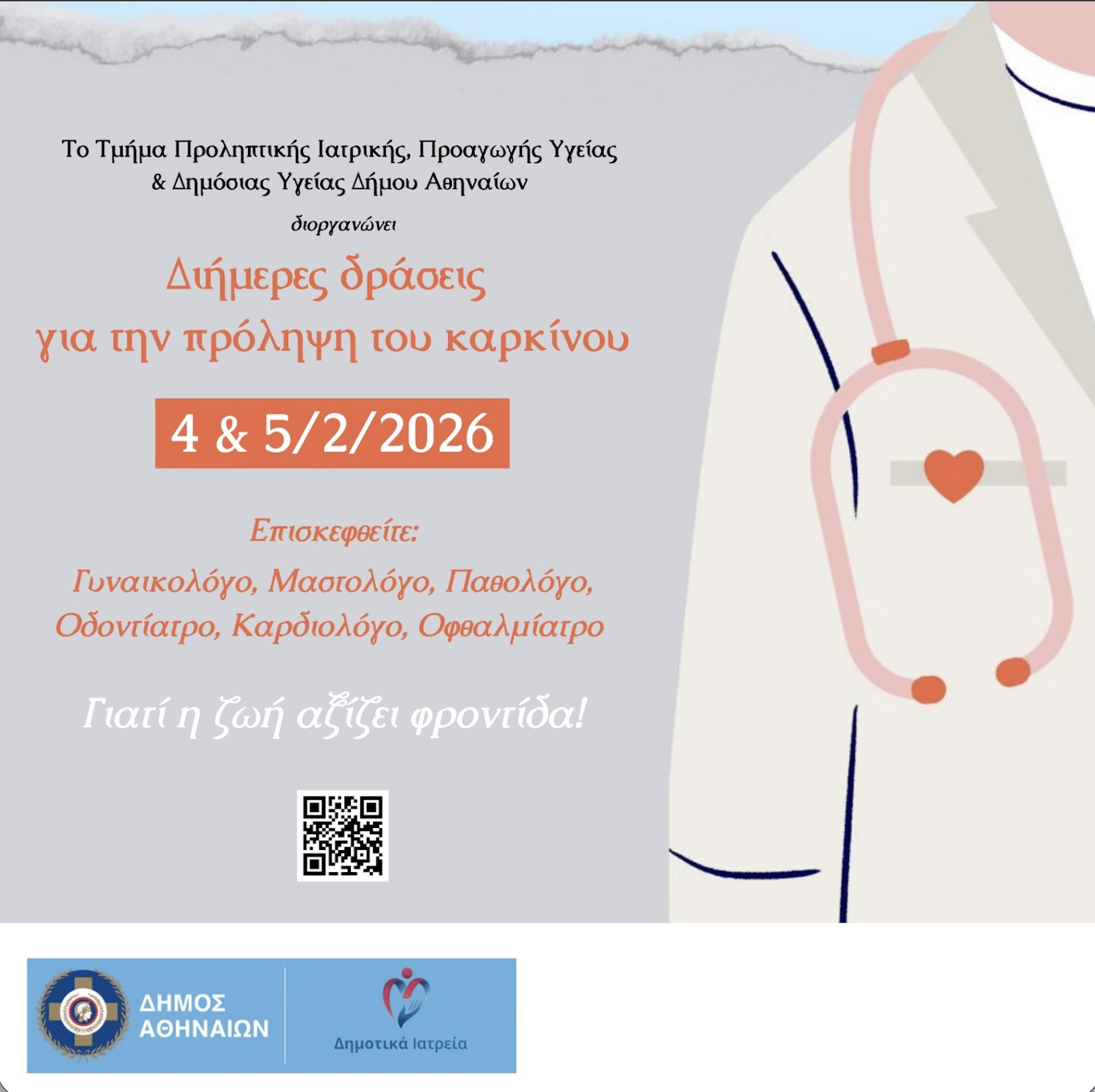 2026/02/02 at 2:49 ΜΜ 02/02/2026 newsroomΜε σταθερό προσανατολισμό την πρόληψη και τη φροντίδα της δημόσιας υγείας, τα Πολυδύναμα Ιατρεία του Δήμου Αθηναίων προσφέρουν ένα πρόγραμμα δωρεάν προληπτικών εξετάσεων, την Τετάρτη 4 & την Πέμπτη 5 Φεβρουαρίου, με αφορμή την Παγκόσμια Ημέρα Κατά του Καρκίνου.