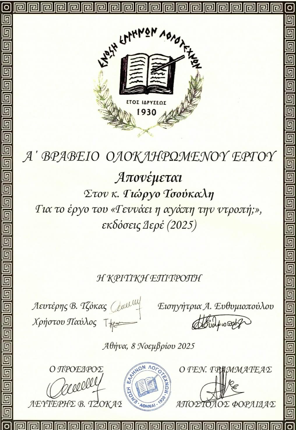 Ο Γιώργος Τσούκαλης απέσπασε το Α΄ Βραβείο Ολοκληρωμένου Έργου για το νέο του βιβλίο με τίτλο «Γεννάει η αγάπη την ντροπή», το οποίο κυκλοφορεί από τις Εκδόσεις Δερέ.